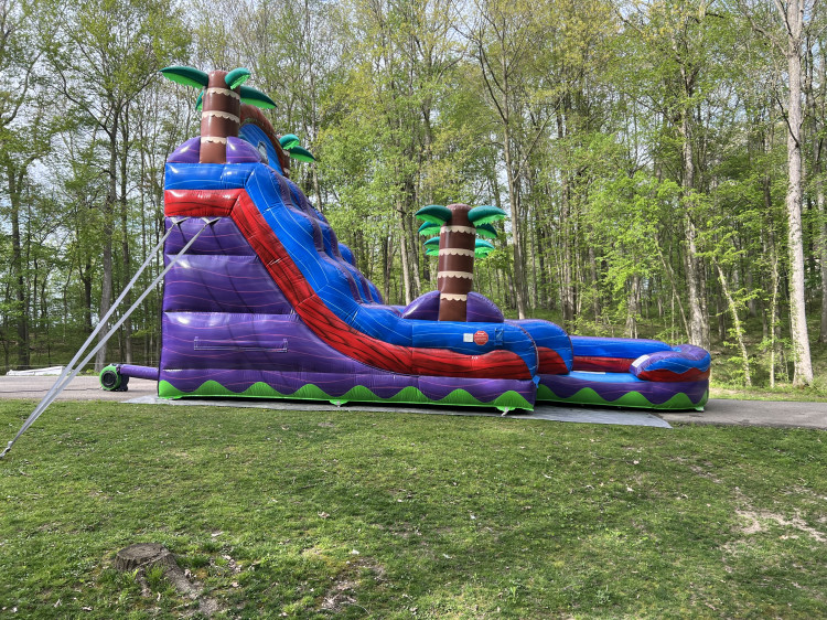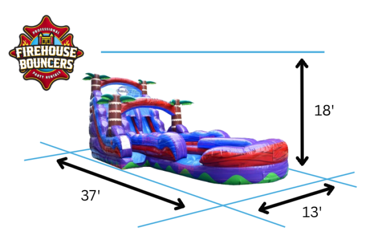Double the lanes = double the fun! The 18' Tropical Hurricane lets you race your friends to the splash zone on two fast, side-by-side lanes. With bold tropical colors, palm trees, and a thrilling drop, this water slide brings high-speed action to any party. It's perfect for backyard showdowns, birthdays, or anyone who loves friendly competition.