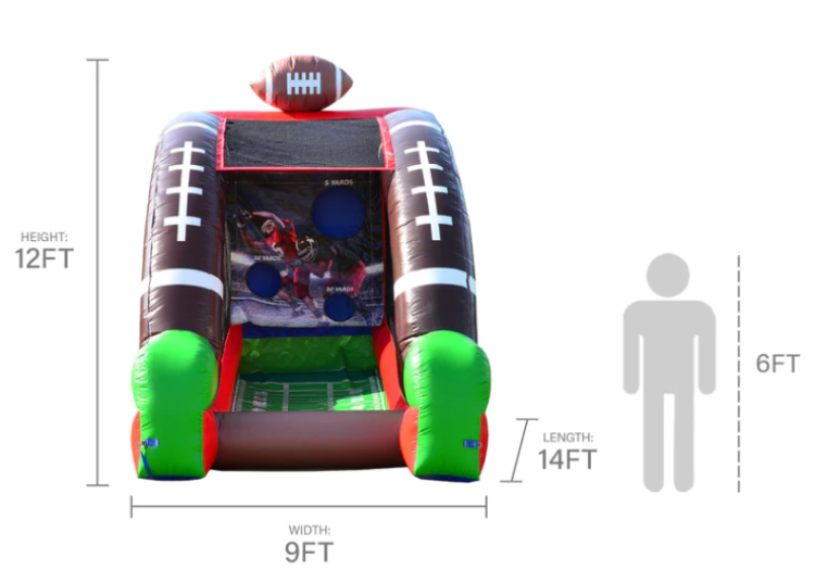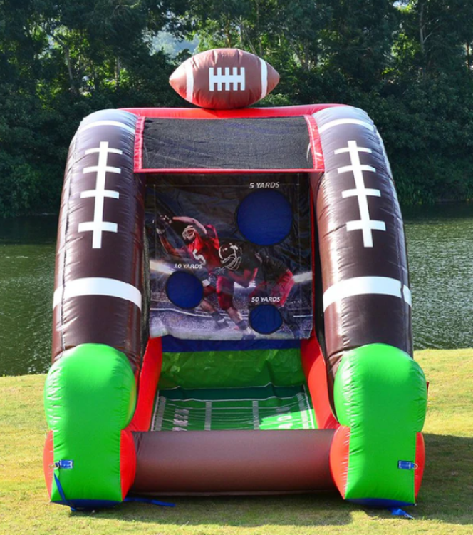 Live out your gridiron dreams with the Football Sports Challenge — an inflatable target game that turns passing practice into friendly competition. Players step up, take aim, and throw the included foam footballs at a back wall outfitted with goal targets and point values. Perfect for school, church, corporate, or backyard events, this compact challenge is great for quick head-to-head matchups or timed scoring rounds that keep everyone cheering.